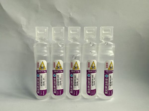 【用法用量】本品不得直接靜脈注射,未經(jīng)稀釋不得進行靜脈滴注。每1g氯化鉀的含鉀量為13.4mmol。用于嚴重低鉀血癥或不能口服者。一般用法將10%氯化鉀注射液10~15m加入5%葡萄糖注射液500ml中滴注。補鉀劑量、濃度和速度根據(jù)臨床病情和血鉀濃度及心電圖缺鉀圖形改善而定。鉀濃度不超過3.4g/L(45mmol/L),補鉀速度不超過0.75g小時(10mmol/小時),每日補鉀量為3~4.5g(40~60mmol)。在體內(nèi)缺鉀引起嚴重快速室性異位心律失常時,如尖端扭轉(zhuǎn)型心室性心動過速、短陣、反復(fù)發(fā)作多行性室性心動過速、心室撲動等威脅生命的嚴重心率失常時,鉀鹽濃度要高(0.5%,甚至1%),滴速要快,1.5g/小時(20mmol/小時),補鉀量可達每日10g或以上。如病情危急,補鉀濃度和速度可超過上述規(guī)定。但需嚴密動態(tài)觀察血鉀及心電圖等,防止高鉀血癥發(fā)生。小兒劑量每日按體重0.22g/kg(3mmol/kg)或按體表面積3g/m'計算。在緊急情況下,氯化鉀應(yīng)用0.9%氯化鈉注射液(除非存在禁忌癥)稀釋后給藥,而不應(yīng)使用含葡萄糖的液體,因為葡萄糖可降低血清鉀水平。【不良反應(yīng)】